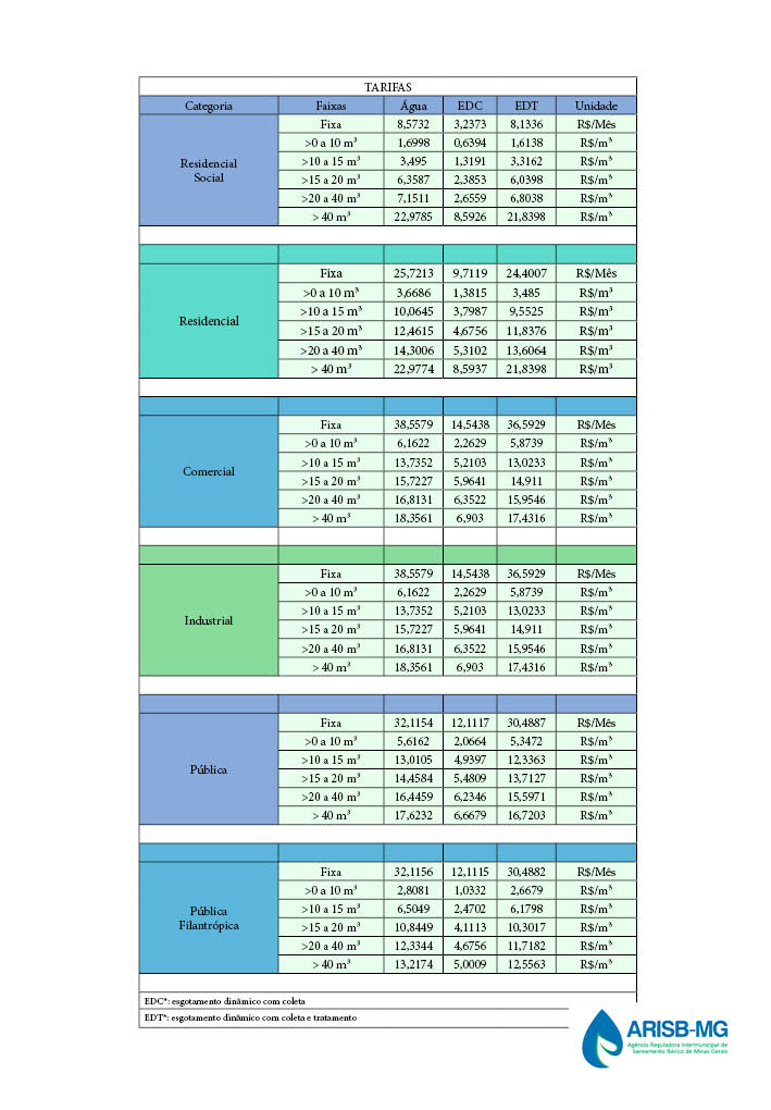 Veja abaixo a estrutura tarifária válida em Ouro Preto: