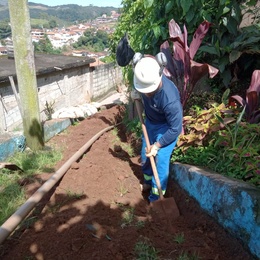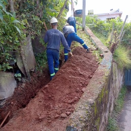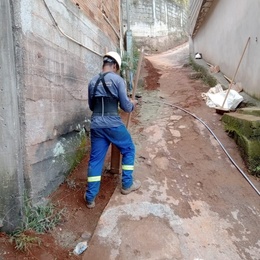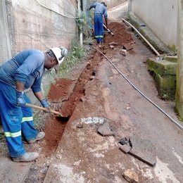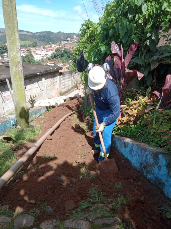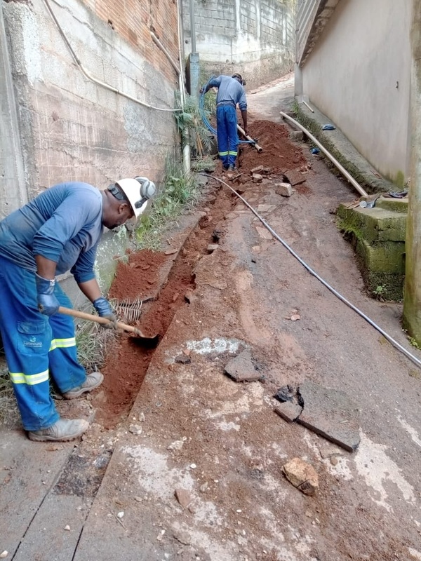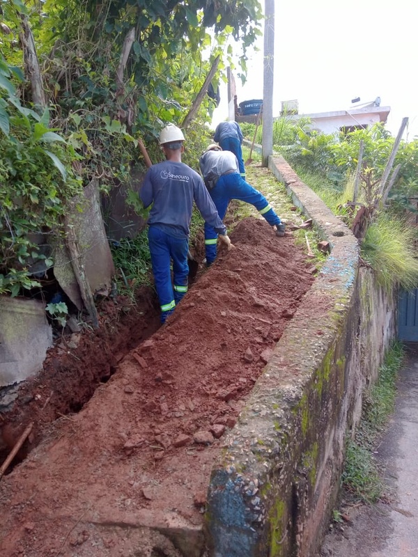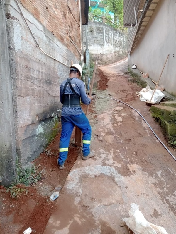Quem merece destaque pelo trabalho desempenhado no local é a equipe de redes da SANEOURO. Além da execução da obra, a equipe tem a tarefa desafiadora de levar materiais e equipamentos manualmente, devido à dificuldade de acesso da via.