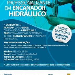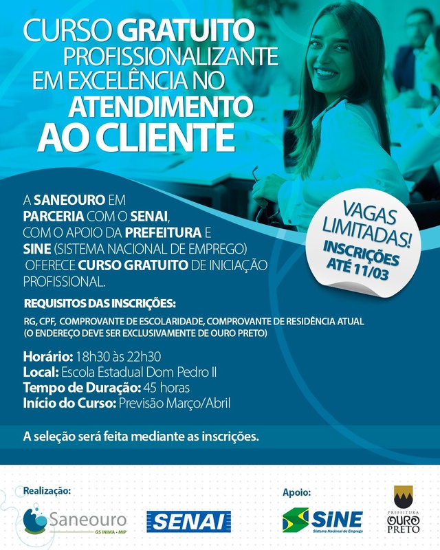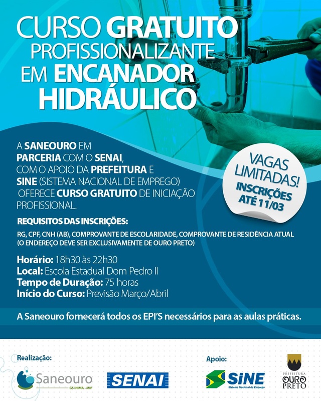 As vagas são para encanador hidráulico e excelência em atendimento. A iniciativa é uma parceria com o Senai e a Prefeitura de Ouro Preto.