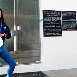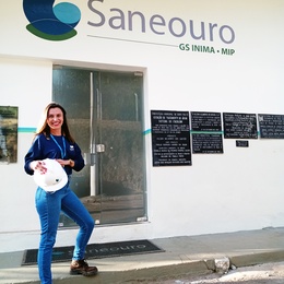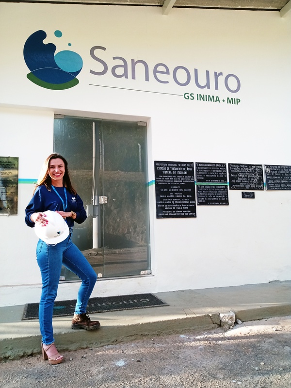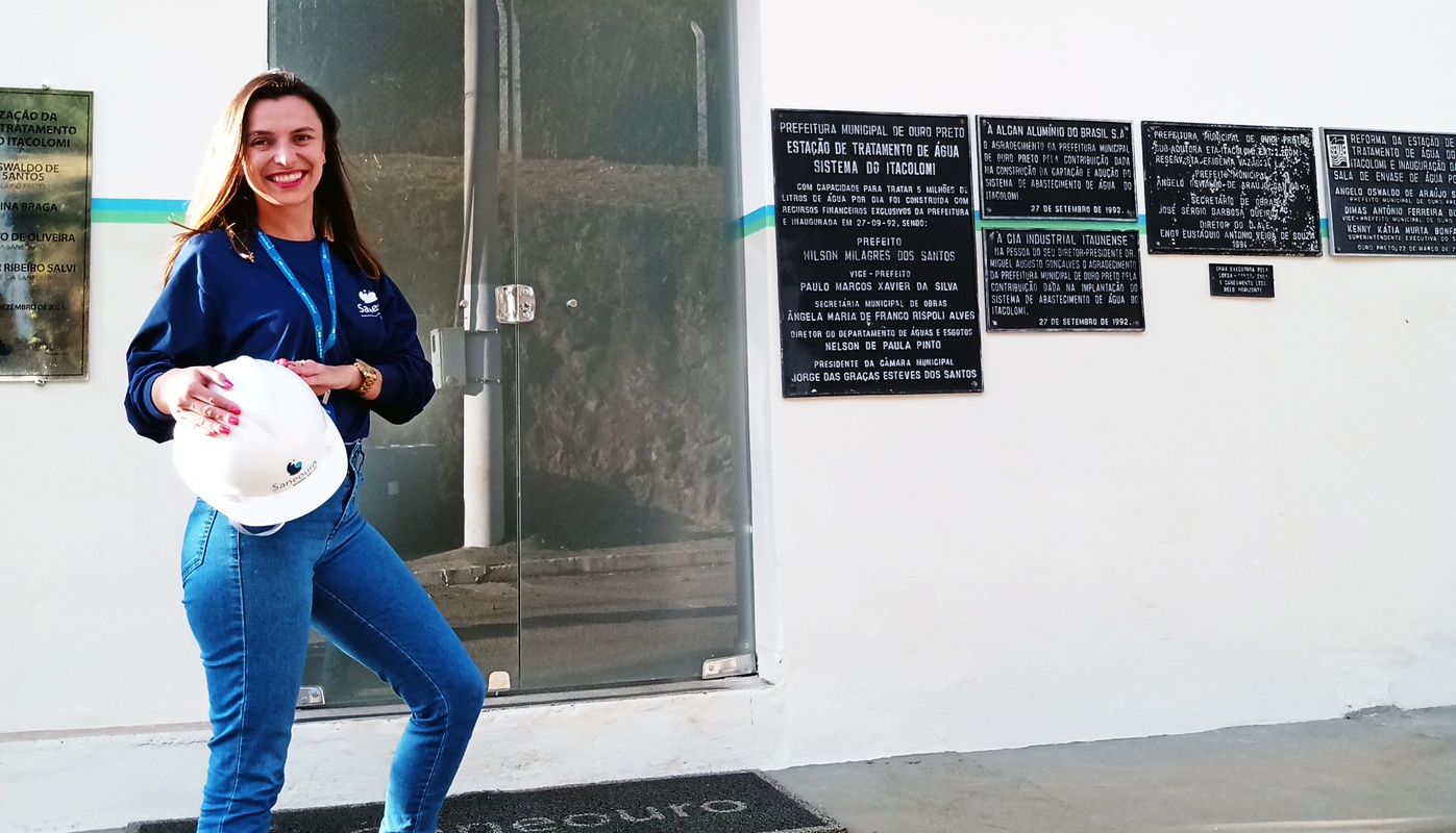 Meu primeiro contato com a área de saneamento foi no estágio. Eu fiz um estágio em Mariana, por volta de um ano e meio mais ou menos. Em seguida, eu me formei e comecei a trabalhar no Serviço Municipal de Água e Esgoto [Semae] aqui de Ouro Preto. Já tem cinco anos que atuo como profissional engenheira ambiental.