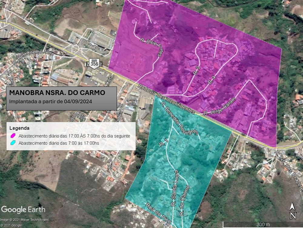 Com o baixo volume do manancial que abastece estes dois bairros, foi necessária a implantação da manobra, que já aconteceu no passado e agora é retomada. Os imóveis localizados na parte baixa do bairro Nossa Senhora do Carmo e na região da rua Élcio Fortes, no bairro Lagoa, serão abastecidos todos os dias entre as 17h e as 7h do dia seguinte. Já os imóveis da parte alta do bairro Nossa Senhora do Carmo receberão água diariamente de 7h às 17h.